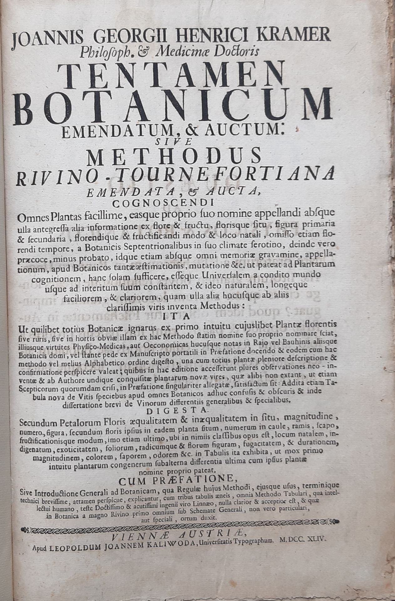 Tentamen Botanicum Emendatum & Auctum sive Methodus Rivino - Tournefortiana Emendata & Aucta, Cognoscendi Omnes Plantas faccillime, easque proprio suo nomine appellandi absque ulla antegressa alia informatione ex flore & fructu, florisque situ, figura primaria & secundaria, florendique & FRuctificandi mo & loco natali, omisso etiam florendi tempore, a Botaicis Septentrionalibus in suo climate...