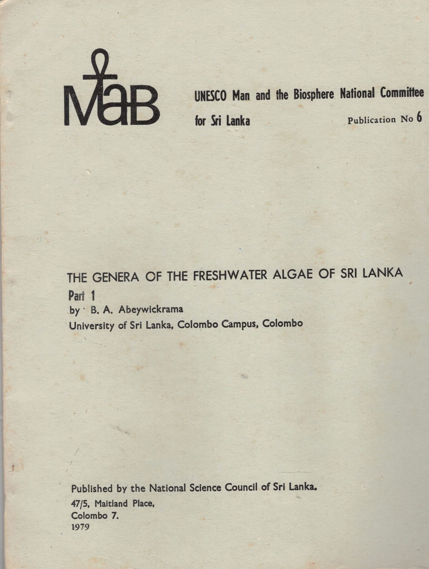 Abeywickrama, B. A.: The Genera of the Freshwater Algae of Sri Lanka. Part II: Cyanophyceae. 1986. ( UNESCO. Man and the Biosphere National Committee for Sri Lanka, Publication No. 10). 45 p.4to. Paper bd. (78791) 22.47